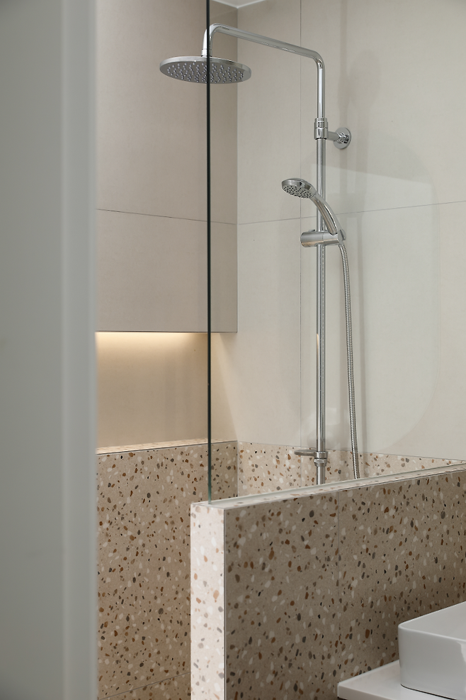조적벽과 유리파티션으로 구분한 샤워부스는 매립선반에 간접등을 넣어 아늑한 분위기가 참 좋아요. 제작 하부장은, 주방 키큰장과 같은 무늬목을 사용했는데 인테리어의 통일감을 주는 것 같아요:)