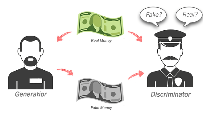 GAN 기술을 처음 제안한 이안 굿펠로는 논문에서 GAN 기술을 ‘위조지폐범’과 ‘경찰’의 예로 들어 설명했습니다.