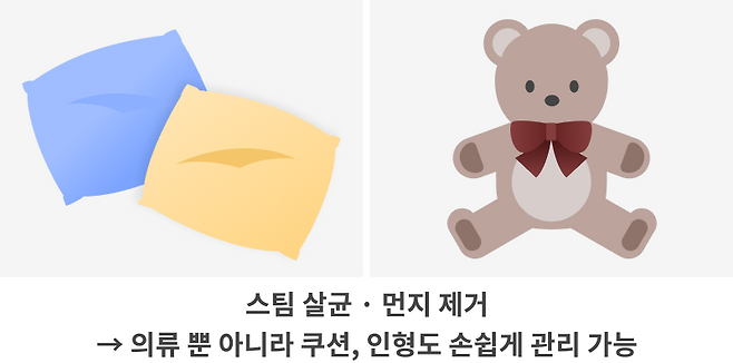 자주 세탁하기 어려운 쿠션이나 인형도 의류 관리기로 관리할 수 있어 청결이 중요한 어린아이가 있는 집에서 사용했을 때 특히 만족도가 높기도 합니다.