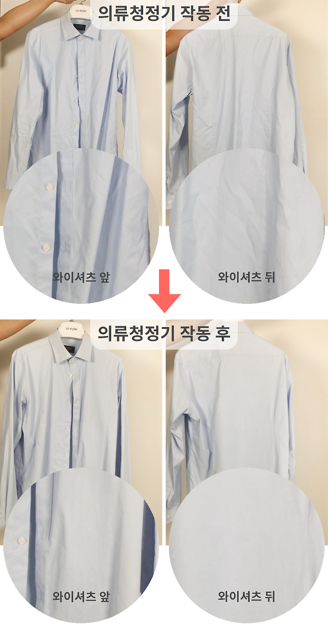 의류 관리기에 다림질이나 드라이클리닝 정도의 구김 제거 효과를 기대해서는 안됩니다.