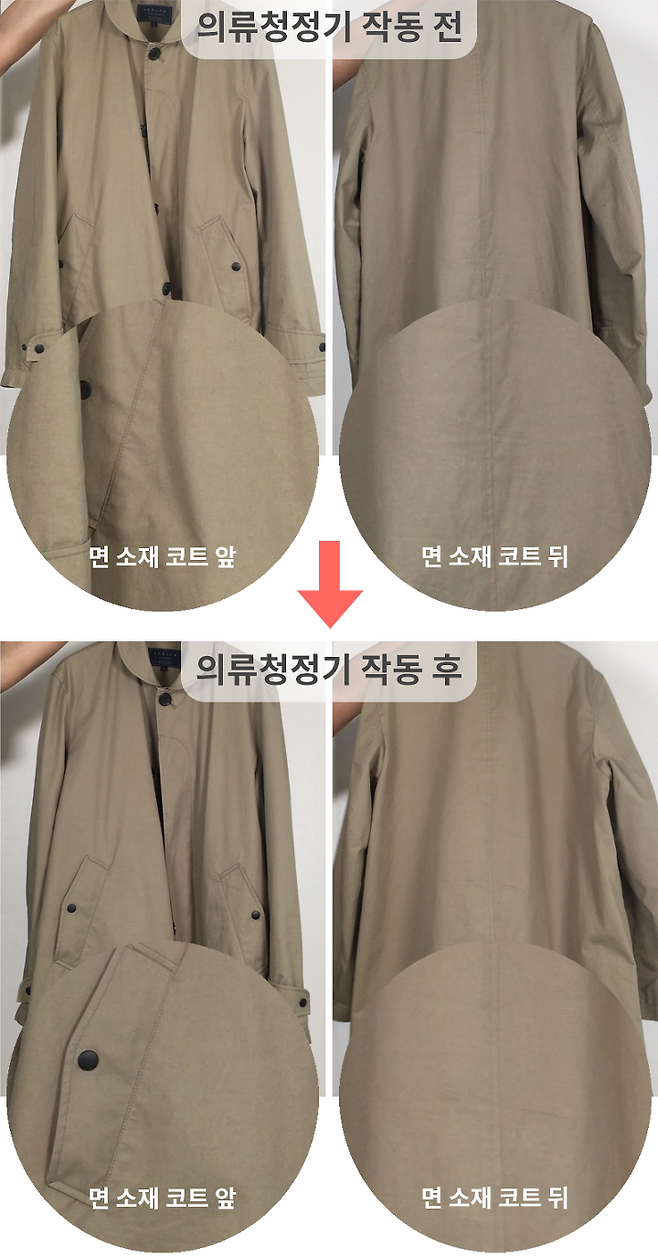 다만, 실제 드라이클리닝과 같이 오염 제거 및 완벽한 구김제거는 되지 않습니다.