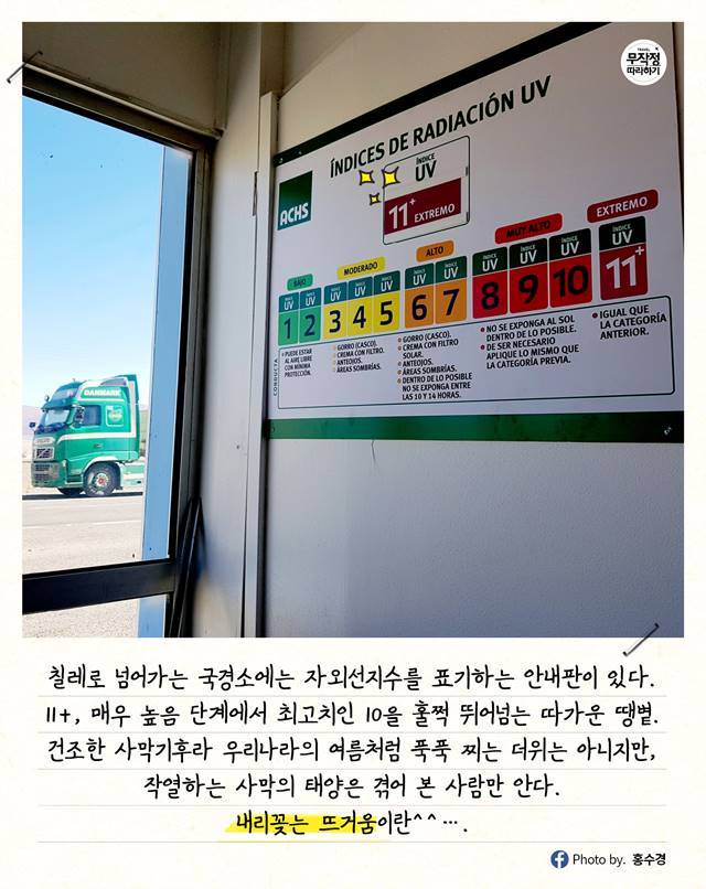 칠레로 넘어가는 국경소에는 그날의 자외선지수를 표기하는 안내판이 있다.