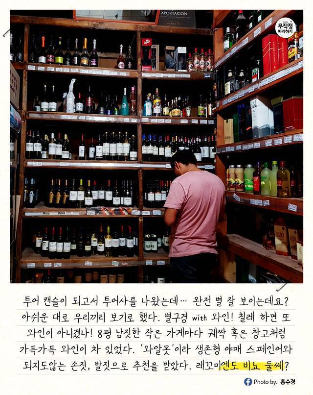 \8평 남짓한 작은 가게마다 궤짝이나 창고같이 온갖 종류 와인으로 가득 차 있는 게 너무 신기했다. 1도 모르는 '와알못'이라 생존형 야매 스페인어와 되지도않는 손짓, 발짓으로 추천을 받았다. 레꼬미엔도 비뇨 둘쎄?