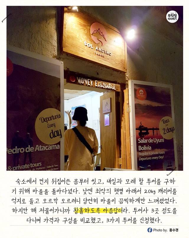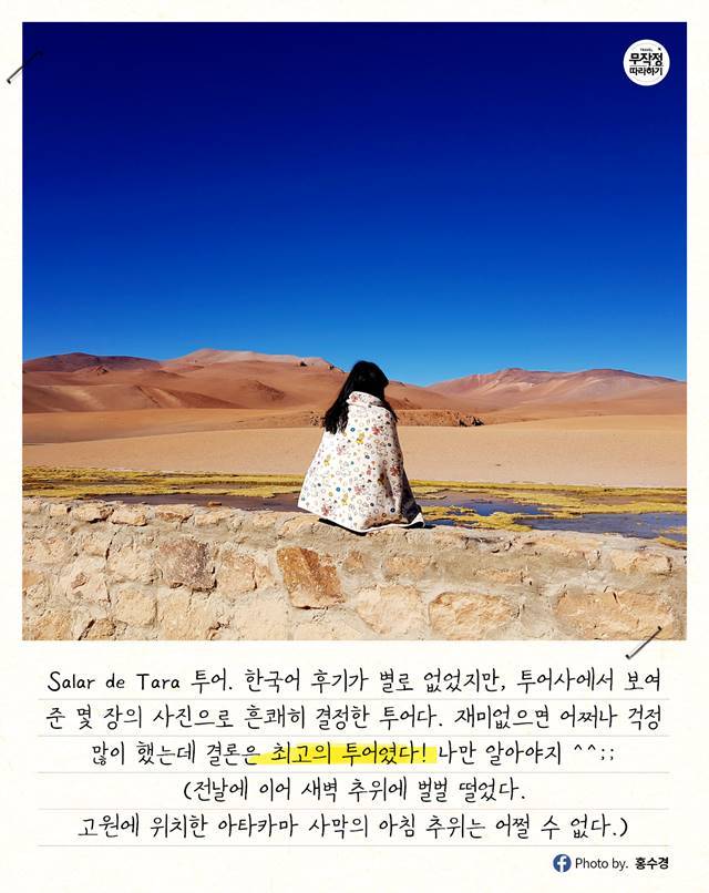 Salar de Tara 투어. 한국 분들이 많이 안 해서인지 유명 포털사이트에도 후기가 별로 없었지만, 투어사에서 보여준 몇 장의 사진으로 흔쾌히 결정한 투어다.