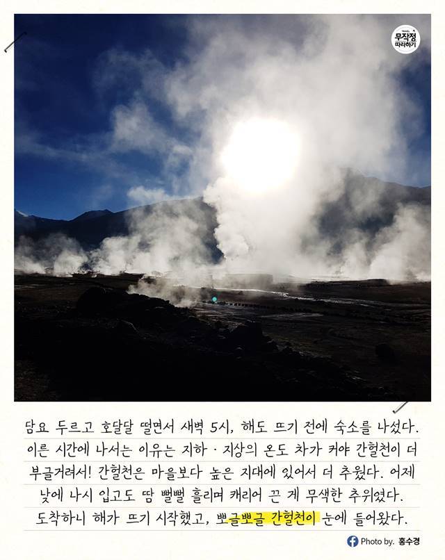 아타카마 사막의 새벽은 너무너~무 춥다. 간헐천은 높은 지대에 있어서 더 추웠다.