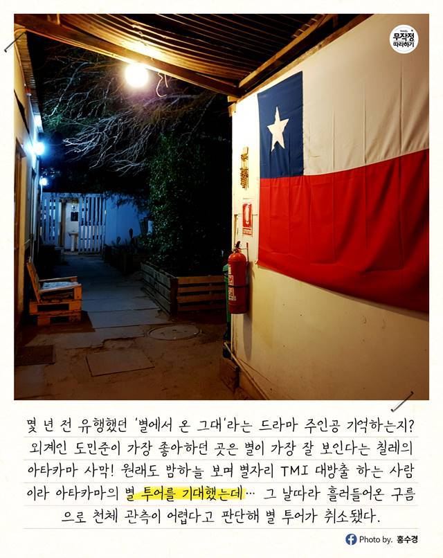 외계인 도민준이 가장 좋아하던 곳은 별이 가장 잘 보인다는 칠레의 아타카마 사막! 처음 남미여행 일정을 짤 때 아타카마를 무조건 넣은 이유는 별 덕후이기 때문.