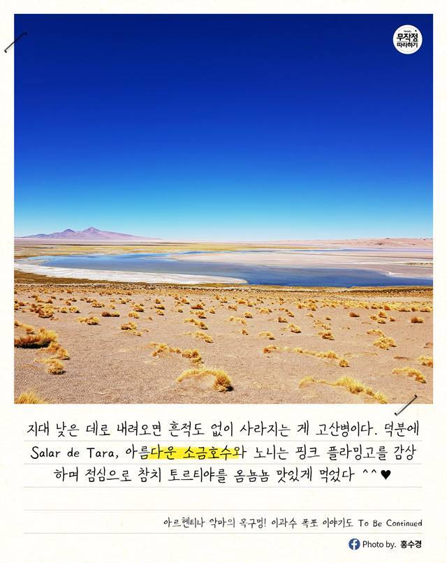 지대 낮은 데로 내려와서는 언제 있었냐는 듯 흔적도 없이 사라지는 게 고산병이다. 덕분에 Salar de Tara, 아름다운 소금호수와 노니는 핑크 플라밍고를 감상하며 점심으로 참치 토르티야를 옴뇸뇸 맛있게 먹었다 ^^♥