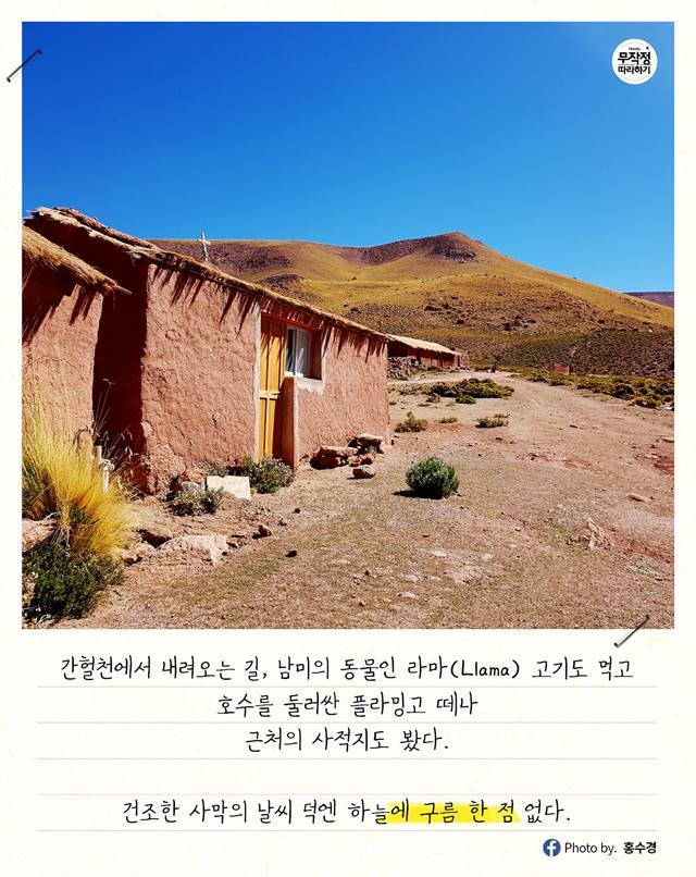 간헐천에서 내려오는 길, 남미의 동물인 라마(Llama) 고기도 먹고 호수를 둘러싼 플라밍고 떼나 근처의 사적지도 봤다.
