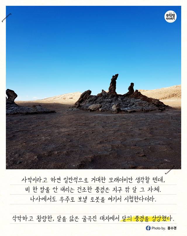 사막이라고 하면 일반적으로 사하라 사막처럼 거대한 모래더미만 생각할 텐데, 비 한 방울 안 내리는 건조한 풍경은 지구 밖 달 그 자체.