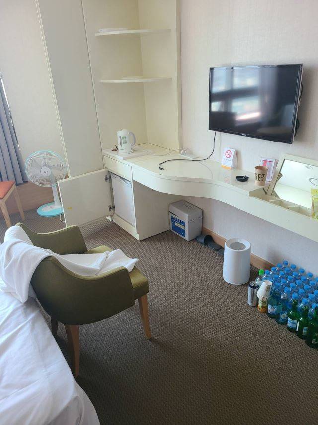 소독과 정리를 마친 다른 방에 들어가서야 비로소 내부 구조를 확인할 수 있었다. 7평(23.2㎡) 남짓한 공간에 싱글 침대와 TV가 하나씩 있었다. 여느 숙박업소와 다른 점은 비품의 양이었다. 20개가 넘는 500㎖ 생수는 물론 커피와 녹차, 세면용품도 일반 호텔보다 눈에 띄게 많았다. 침대 맡엔 쓰레기 처리 요령과 식사 요청 방법이 적힌 종이가 붙어 있었다.