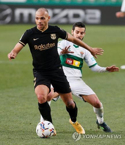 epa08962629 Elche's midfielder Victor Rodriguez (R) duels for the ball against Barcelona's striker Martin Braithwaithe (L) during their Spanish LaLiga soccer match between Elche FC and FC Barcelona at Martinez Valero stadium in Elche, Alicante, eastern Spain, 24 January 2021. EPA/Manuel Lorenzo