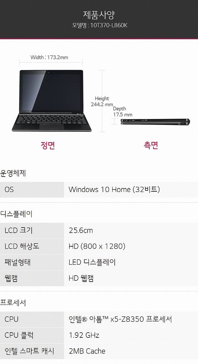 10.1인치 규격에 1280x800 해상도, 광시야각, 터치 스크린 지원 LED 디스플레이를 적용하고 Intel Atom x5-Z8350 프로세서를 탑재한 LG 투인원PC 10T370-L860K는 출시한지 다소 시간이 지난 제품이긴 하지만 그만큼 낮은 가격대인 20만원 내외에 위치하고 있으며, 앞서 언급한 동영상 시청 및 채팅, 간단한 문서 작업 용도로써는 충분한 성능을 갖추고 있습니다. 가격대 성능비와 더불어 장점으로 꼽히는 휴대성은 본체 크기나 도킹 키보드 뿐만 아니라 오랜 사용 시간을 보장하는 배터리, micro 5핀 USB 케이블을 통한 보조 배터리 충전 등의 요소까지 포함되어 있어 편의성까지 확실히 갖춘 상태라 할 수 있겠습니다.