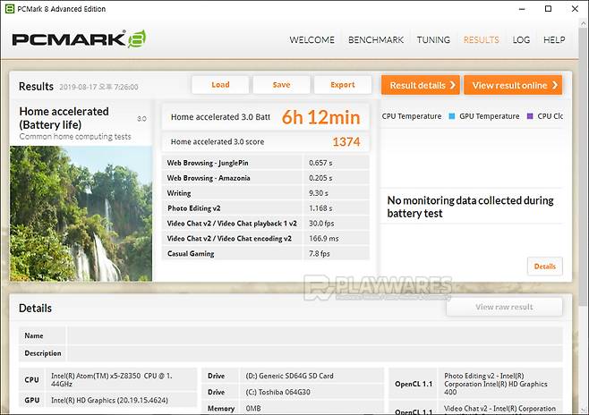 플레이웨어즈의 노트북 리뷰에서는 기본적으로 PCMark 8 배터리 테스트 항목을 측정하는데, LG 투인원PC 10T370-L860K의 경우 태블릿 형태로도 휴대가 가능한 만큼 키보드 장착 / 미장착 상태를 구분하여 테스트를 진행해보았습니다.