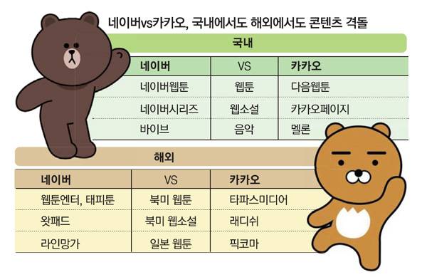 카카오 군단이 북미로 출격을 준비하면서, 네이버와의 콘텐츠 경쟁도 더욱 치열해질 전망이다. 국내에선 양 사가 웹툰, 웹소설, 음악, 영상까지 전방위적인 경쟁을 벌이고 있다. 세계 최대 만화 시장인 일본에선 후발 주자로 시작한 카카오가 자회사 카카오재팬의 콘텐츠 플랫폼 '픽코마'를 앞세워 '라인망가'(네이버의 일본 웹툰 서비스)를 제치고 매출 기준 1위를 차지했다.