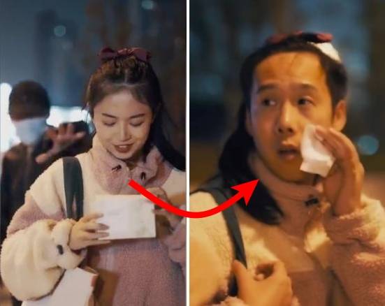 이후 치한으로 의심되는 남성이 여성의 어깨를 붙잡아 돌리는 순간, 화면에는 길을 걷던 여성 대신 남성이 등장한다. 여성이 의미심장한 표정을 꺼낸 것은 화장을 빠르고 깨끗하게 지울 수 있는 클렌징티슈고, 이를 이용해 화장을 지우는 순간 본래의 민낯이 드러났다는 설정이다.