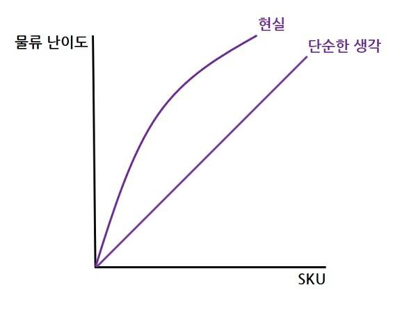 위 도표의 ‘곡선’처럼 SKU는 10이 늘면 난이도가 20으로 폭발적으로 증가하는 식이다. 예를 들어, 새로 열 가지(10-SKU)의 상품이 물류센터로 납품 계약이 성사됐고 그중 아보카도가 끼어있다고 가정하자. 아보카도는 인기가 많은 과일이다. 주문이 들어오면, 한 번 창고에 들어갈 때 자몽을 한두 개를 꺼낼 때 아보카도는 삼십 개를 꺼내야 하는 수고가 필요할 수 있다.