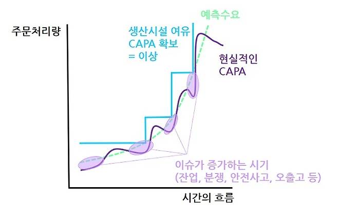 문제는 사람에게는 숙련도, 몸과 마음의 컨디션, 출석율이라는 변수가 존재해 수요에 못 미치는 캐파가 나올 수 있다는 점이다. 처음 신규센터를 오픈하면 시설 캐파도 넉넉하고 일당에 프로모션을 막 붙여 사람도 넉넉하게 뽑아 놓았으나, 일이 익숙하지가 않아 현실 캐파는 떨어질 수 있다. 이후 어느 정도 익숙해지면 수요에 넉넉히 대응할 수준이 된다.