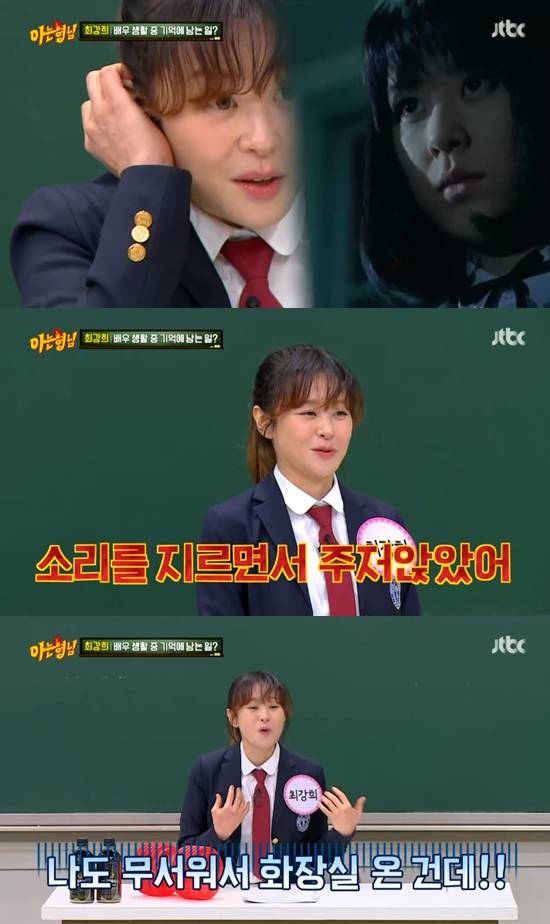 또한 최강희는 "그러고 회장실에 갔는데 어떤 사람이 들어온 거다. 문을 조심스럽게 열고 나갔다. 그때 단발머리에 하얀 민소매 원피스를 입었는데 (나를 보고) 놀랠까 봐 천천히 고개를 들었다. 나를 발견한 분이 털썩 주저 앉아 소리를 질렀다"며 "나도 내가 무서워서 화장실에 왔는데 그분은 얼마나 놀랐겠냐"고 웃음을 지었다.