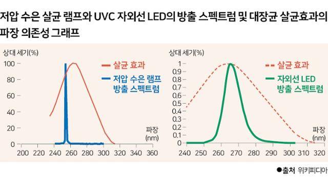 대장균을 포함한 다양한 세균에 대한 자외선 조사 실험은 자외선의 살균 효과가 UVC의 약 260~270㎚ 파장 영역에서 최대가 됨을 보여준다. 따라서 이 파장을 낼 수 있는 UVC LED나 발광 파장이 254㎚인 수은 램프가 살균용으로 적합할 것이다. 만약 자외선의 파장이 이보다 길어지면 살균 효과가 줄어들다가, 315㎚ 파장보다 커져 UVA의 영역으로 들어가면 살균 효과가 매우 떨어진다.