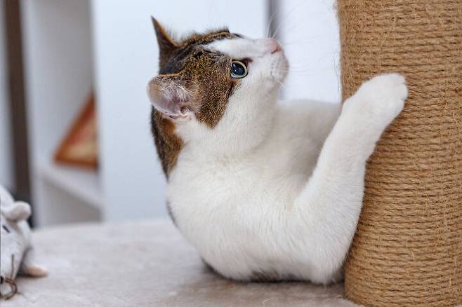 집사를 바라보며 "야옹"소리와 함께 스크래쳐에 발톱을 긁는 행동도 반가움의 표시입니다.