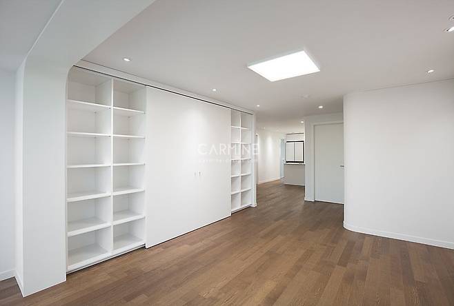 저희 거실의 또 다른 포인트는 내력벽 뒤에 숨겨진 벽선반이에요.