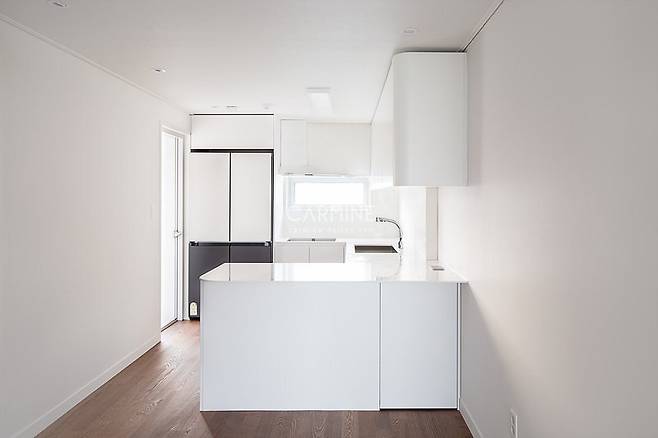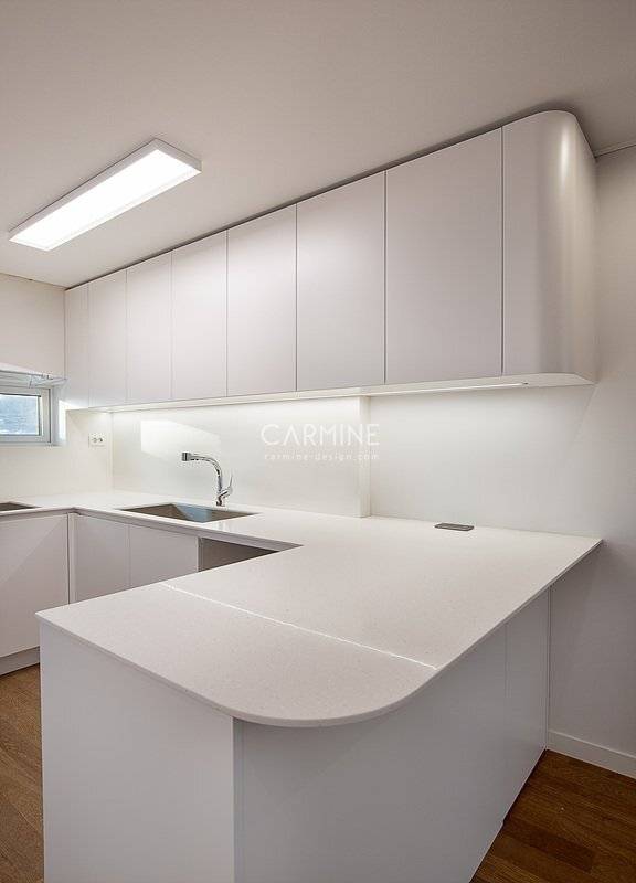 하얀 부엌이 청소하기 어렵다고들 하는데 부엌 상판은 어차피 잘 닦이는 소재고, 부엌에는 늘 물건이 많기 때문에 그나마 하얗게 해야 덜 지저분해 보이는 거 같아요. 원하는 대로 멋을 내기에도 하얀 바탕이 더 좋고요.