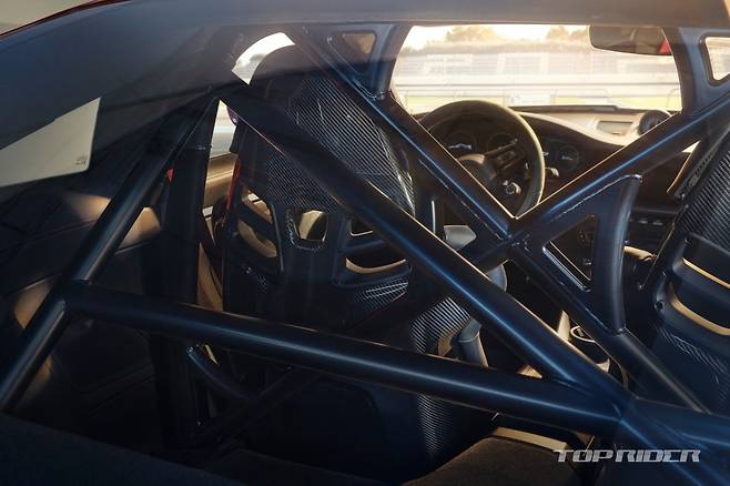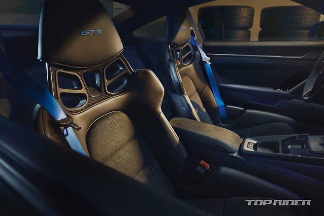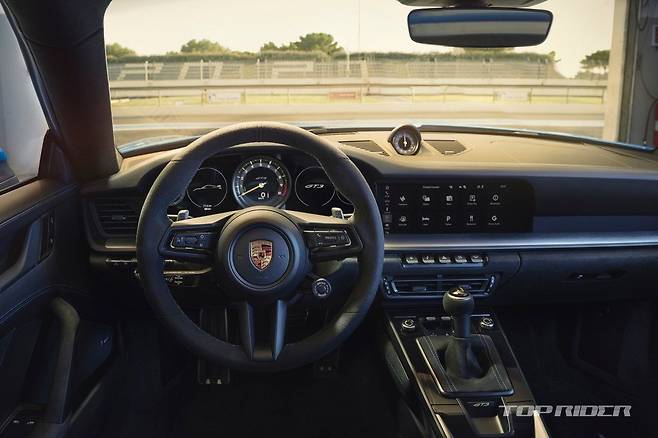 실내에는 현행 911 모델의 특징을 따르면서 트랙 스크린이 추가됐다. 버튼을 누르면 1만rpm까지 엔진 회전수를 표시한 중앙 타코미터, 서킷 주행에 필요한 정보인 타이어 공기압과 오일 압력, 온도, 연료 탱크 레벨과 냉각수 온도가 표시된다. 시프트 라이트도 제공된다.