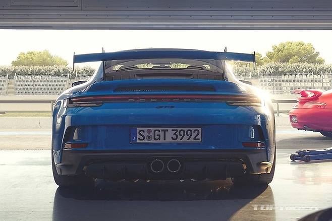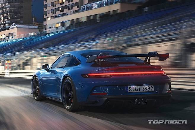 신형 911 GT3는 새로운 윙과 디퓨저가 적용돼 고속 코너링시 다운포스가 크게 증가했다. 새로운 리어 윙은 911 RSR에서 사용된 바 있다. 모터레이싱 경험에서 쌓은 정교한 에어로다이내믹 노하우를 활용해 공기저항 계수에 영향을 미치지 않고 다운포스를 생성한다.