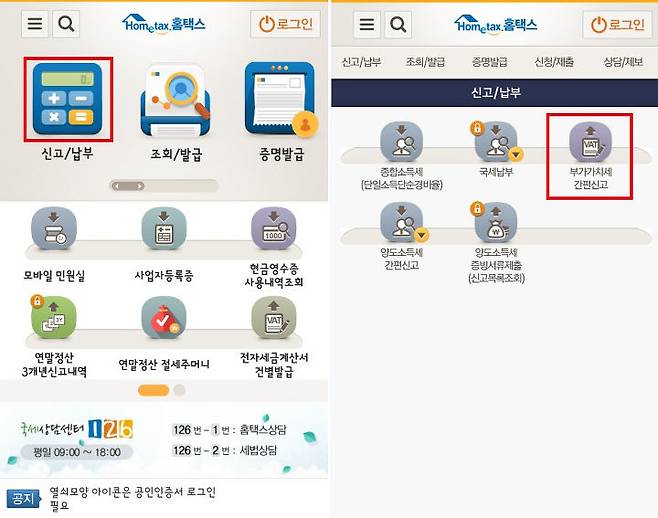 스마트폰에서 ‘홈택스 앱’을 내려받아 설치 후 회원 로그인 후 ‘세금신고’→‘부가가치세 간편신고’ 메뉴를 선택해 신고하면 됩니다.
