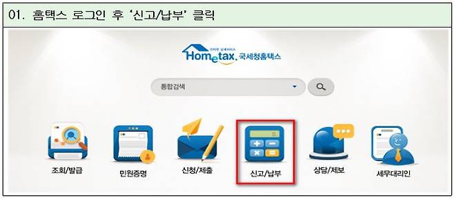 국세청 홈택스(www.hometax.go.kr )에서 회원 로그인 후 세금 신고/납부 버튼을 클릭합니다.