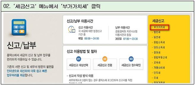 다음 화면의 우측상단 '세금신고' 항목에서 부가가치세를 클릭합니다.