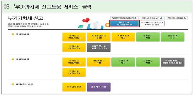 부가가치세 신고 선택 화면의 상단에 있는 [부가가치세 신고도움서비스]를 클릭하시면, 신고시 유익한 내용을 확인할 수 있습니다. 위와 같이 부가가치세 신고선택 화면이 나타나면 사업자유형에 따라 ‘일반과세자 또는 간이과세자’ 클릭해 신고해 주시면 됩니다.
