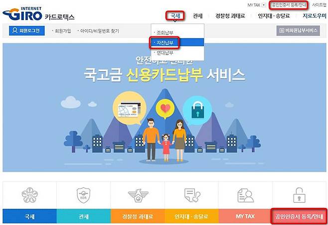 - 국세납부 ⇒ 자진납부선택 ⇒ 공인인증서 확인 ⇒ 납부정보 입력 ⇒ 납부하기 ⇒ 신용카드번호 입력 ⇒ 납부확인 ⇒ 국세전자납부확인서 출력