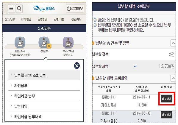 홈택스 홈페이지에 접속, 공인인증서로 로그인 후 ‘신고납부’ ⇒‘국세납부’ 선택하면 됩니다. 본인 명의의 계좌가 필요합니다.