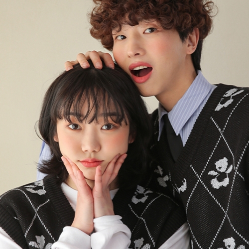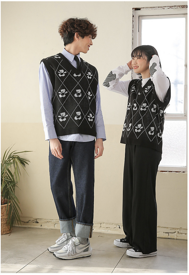 아코의 시그니처 곰돌이가 돋보이는 아가일 패턴으로 제작된 루즈핏의 니트 베스트입니다.