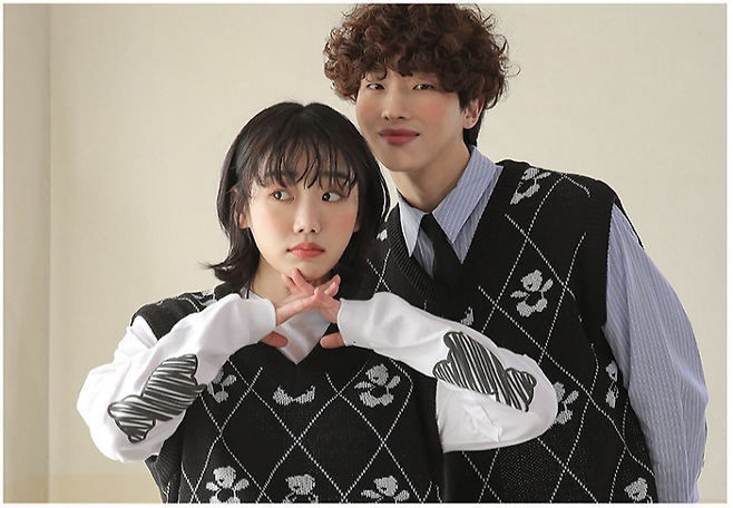 화이트 셔츠와 곰돌이 무늬의 블랙 베스트를 매치해 감각적인 스타일링을 완성했습니다.