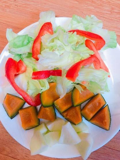 저녁: 단호박 4조각, 파프리카 5조각, 양상추 한줌, 사과 2조각 (단호박 대신 고구마, 닭가슴살, 닭가슴살 소시지 등을 대체해 먹기도 함)