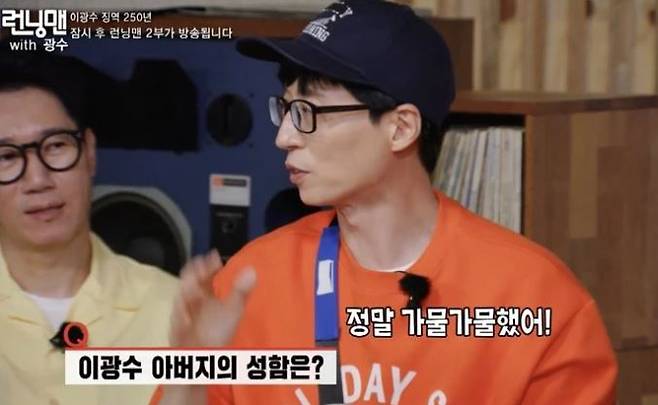 지난 13일 방송된 '런닝맨'에서는 이광수가 그동안 지은 범법 행위로 받은 형량을 미션을 통해 모두 감형해야만 끝나는 레이스가 펼쳐졌다. 이날 제작진은 감형 40년을 걸고 '이광수 모의고사'를 진행해, 멤버들에게 이광수 관련 퀴즈를 냈다. 이중 유재석에게 "이광수의 아버지 성함은?"이라는 질문을 했는데 유재석은 "제가 정말 가물가물했다"면서도 "이거 아닐까 싶다"고 답을 적어넣었다.
