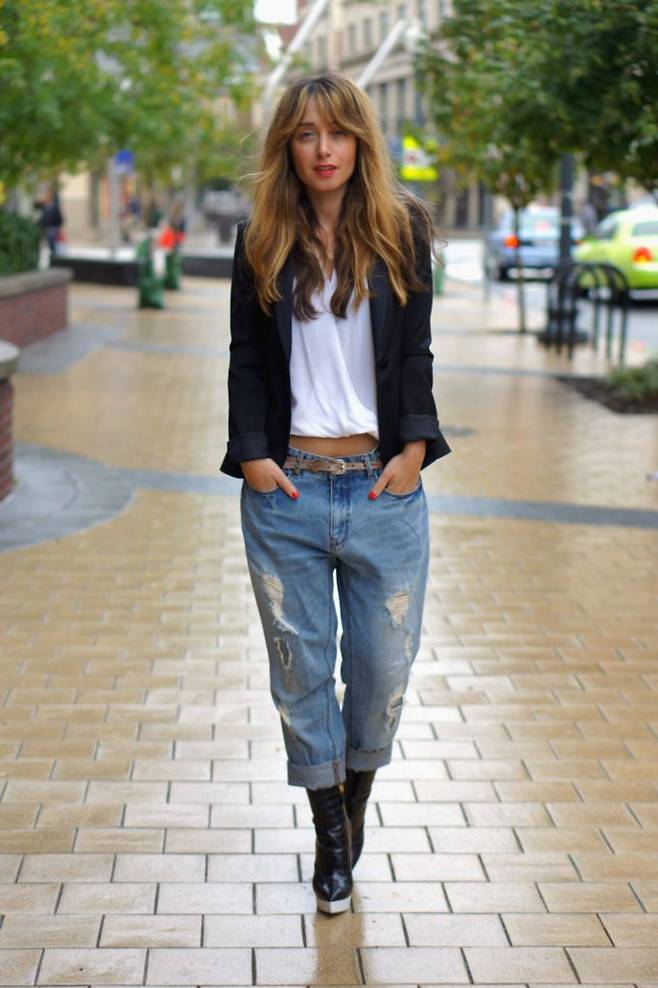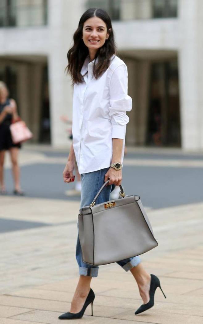 화이트 블라우스와 청바지는 오랫동안 변하지 않는 스타일 공식이다. 반복해서 입어도 지루하지 않지만 변화를 주고 싶다면 청바지에 버튼다운 셔츠와 드레이프진 페플럼을 매치하고 기죽 재킷과 뮬로 마무리하면 요즘 트렌드로 변신할 수 있다. 또는 레이스가 달린 화이트 블라우스와 예쁜 펌프스를 매치하면 또다는 이미지를 연출할 수 있다.
