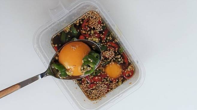 혹시 노른자장 좋아하시는 분들 계신가요? 그런 분들은 간장에 홍고추 2개와 청양고추 3개를 총총 썰어 넣고 깨랑 참기름 2스푼을 넣어주세요. 달래를 추가해주시면 더 맛있어요. 그다음 계란 노른자를 풀어주시면 됩니다. (ノ ̿ ̿ᴥ ̿ ̿)ノ