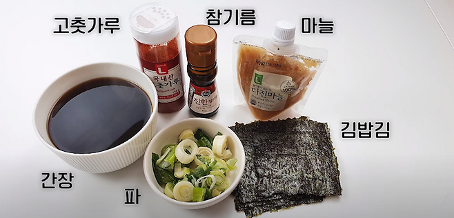 간장 활용 음식 첫 번째는 바로 김장아찌에요. 김밥김, 간장, 파, 마늘, 고춧가루, 참기름만 있으면 된답니다. 우선 김밥김을 취향에 따라 잘라서 밀폐용기에 담아주세요.