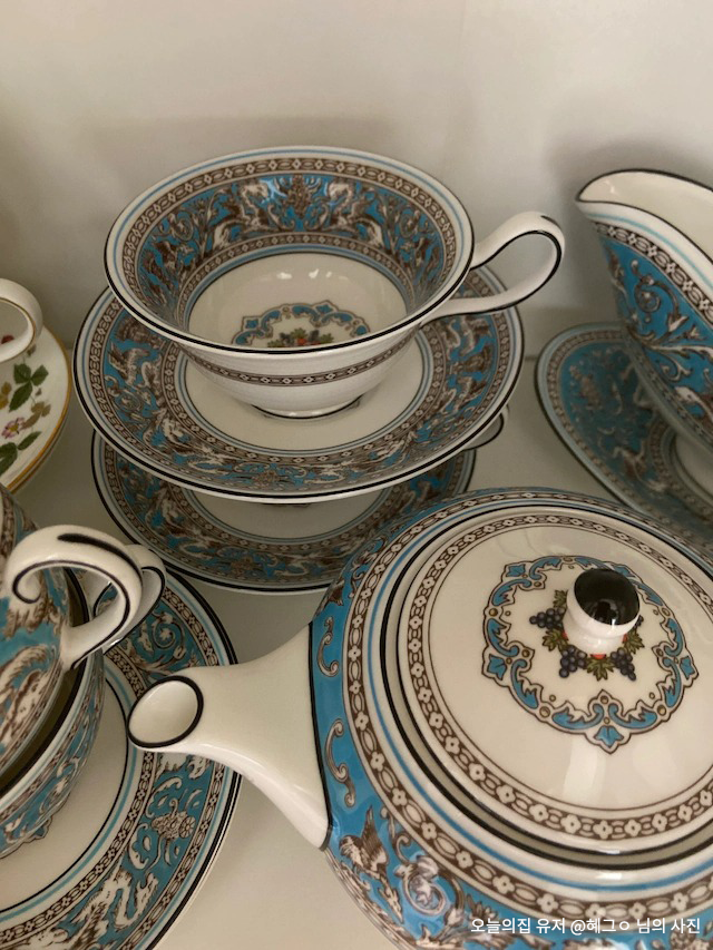 웨지우드 플로렌틴 터쿼이즈 시리즈는 우아하고 고급스러운 청록색의 문양이 그려져있어서 고급미가 가득해요! 영국의 티타임 분위기를 집에 옮겨온 느낌~