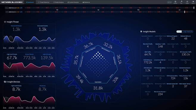 넷블랙은 기업에서 발생하는 전체 네트워크의 모든 패킷을 실시간으로 100% 저장하고 재현 가능한 보안솔루션이다. 10Gbps의 초고속 네트워크 망에서도 단 하나의 데이터 유실 없이 100% 수집·분석이 가능하다. 네트워크에서 발생하는 모든 패킷을 고속으로 수집·분석해 보안 위협을 발견하고 선별 대응한다. 자체 개발한 데이터베이스를 이용해 분석 속도를 높이고 저장 공간에 효율을 극대화한 것이 장점이다.