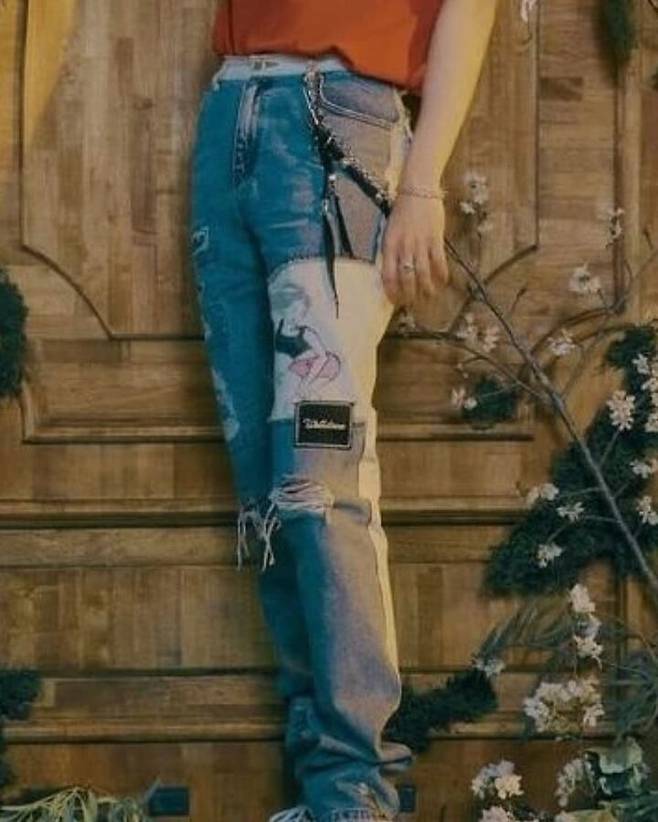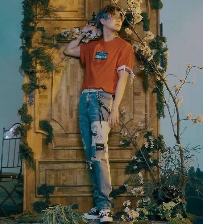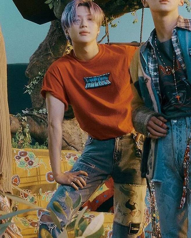 사진 속 태민은 티셔츠에 여성 그림이 그려진 데님 팬츠를 매치했는데요.