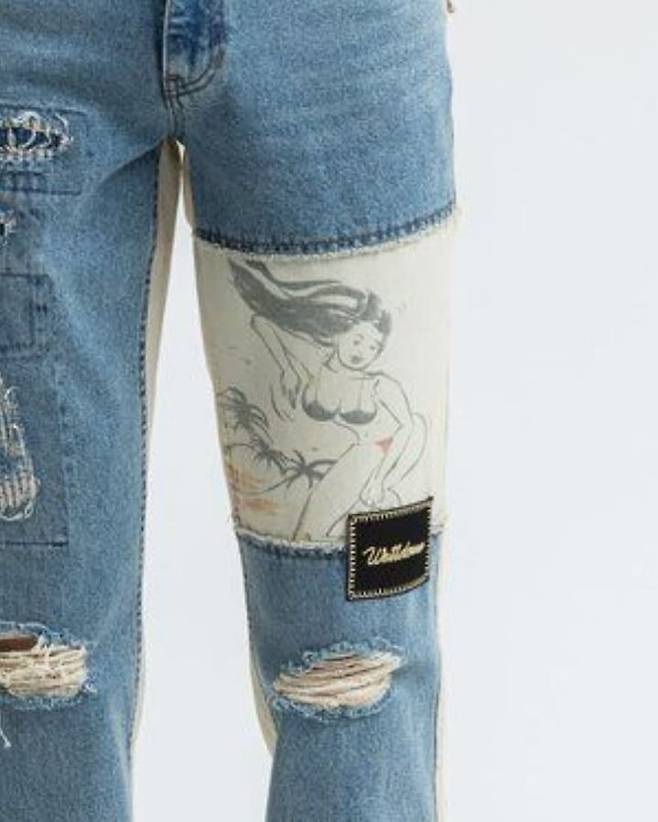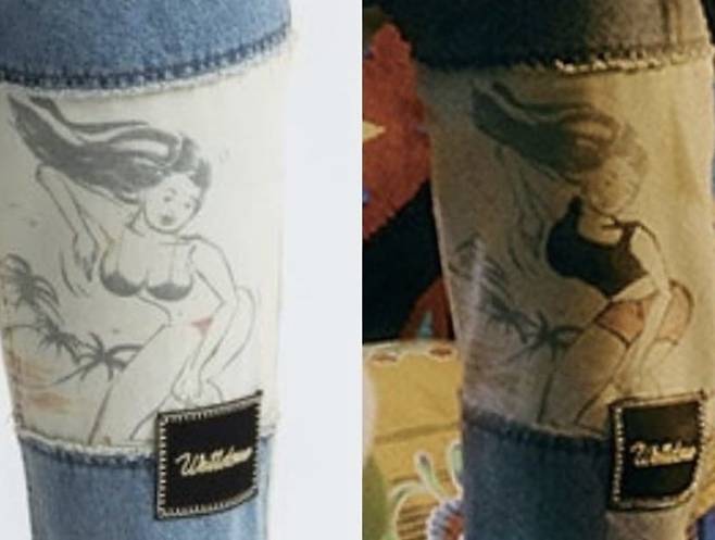 본래 제품에는 여성이 비키니를 입고 있었으나 태민이 입은 바지에선 슬리브리스 탑을 입은 모습으로 수정돼 새롭게 탄생했습니다.