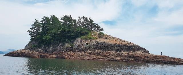섬 한 바퀴를 도는 데 한 시간이면 충분한데요. 유난히 동백나무가 눈에 많이 띄어요. 멀리서 섬을 보면 동백나무 잎이 반짝반짝 빛나, 수우도의 가장 높은 봉우리는 은박산(해발 195m)으로 불린다고 해요. 섬 일주를 마친 뒤, 인심 좋은 선장은 잡은 생선을 몇 마리 그냥 주셨어요. 싱싱했는데요. 양식하는 홍합과 물미역도 주며 홍합 미역국을 끓여 먹으라고 하시네요.
