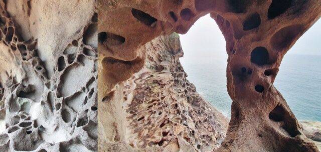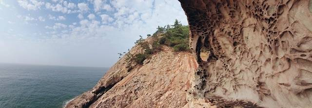 조금 더 능선을 타니 해골바위로 내려가는 이정표가 보여요. 가파른 산길을 내려가니 오전에 배를 타고 보았던, 구멍 숭숭 뚫린 해골바위가 눈앞에 펼쳐져요. 조심스럽게 바위를 타고 해골바위 속으로 스며들어요. 마치 정교하게 정으로 바위를 깨서 둥글둥글한 모양을 만든 것처럼 기하학무늬가 자연의 신비를 느끼게 해요.