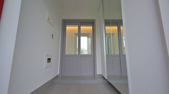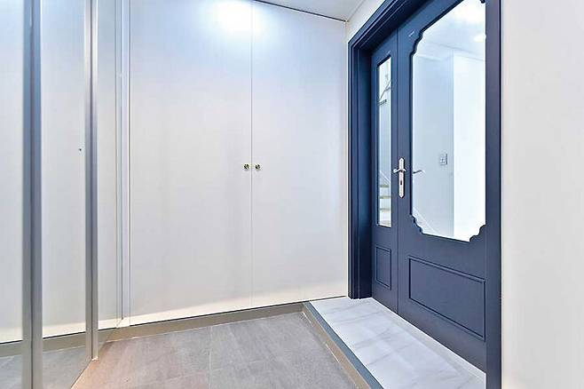 그레이와 화이트톤을 사용하여 모던하게 연출했다. 화이트 신발장에 거울을 부착해 공간이 더욱 넓어 보이는 효과를 주었다.