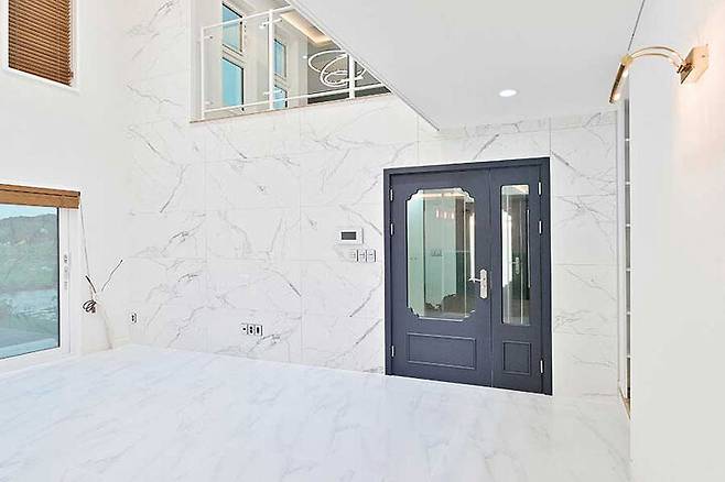 1층의 거실은 비앙코 타일을 적용해 깨끗하면서도 고급스러운 아트월을 연출했다. 거실과 식당 사이에 파티션 가벽을 설치해 공간을 분리했다. 하이실링으로 2층까지 개방한 공간 그리고 통유리창으로 들어오는 시선은 편안함과 시원한 개방감을 선사한다.