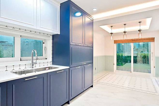 다크 블루 색상 주방가구와 골드 포인트 타일을 적용하여 고급스러운 주방의 모습을 연출했다. 식당 공간의 루버는 카페 분위기를 낸다. 주방가구는 자체 제작 노블핏 맞춤가구로 시공해 디자인과 실용성을 동시에 충족했다.